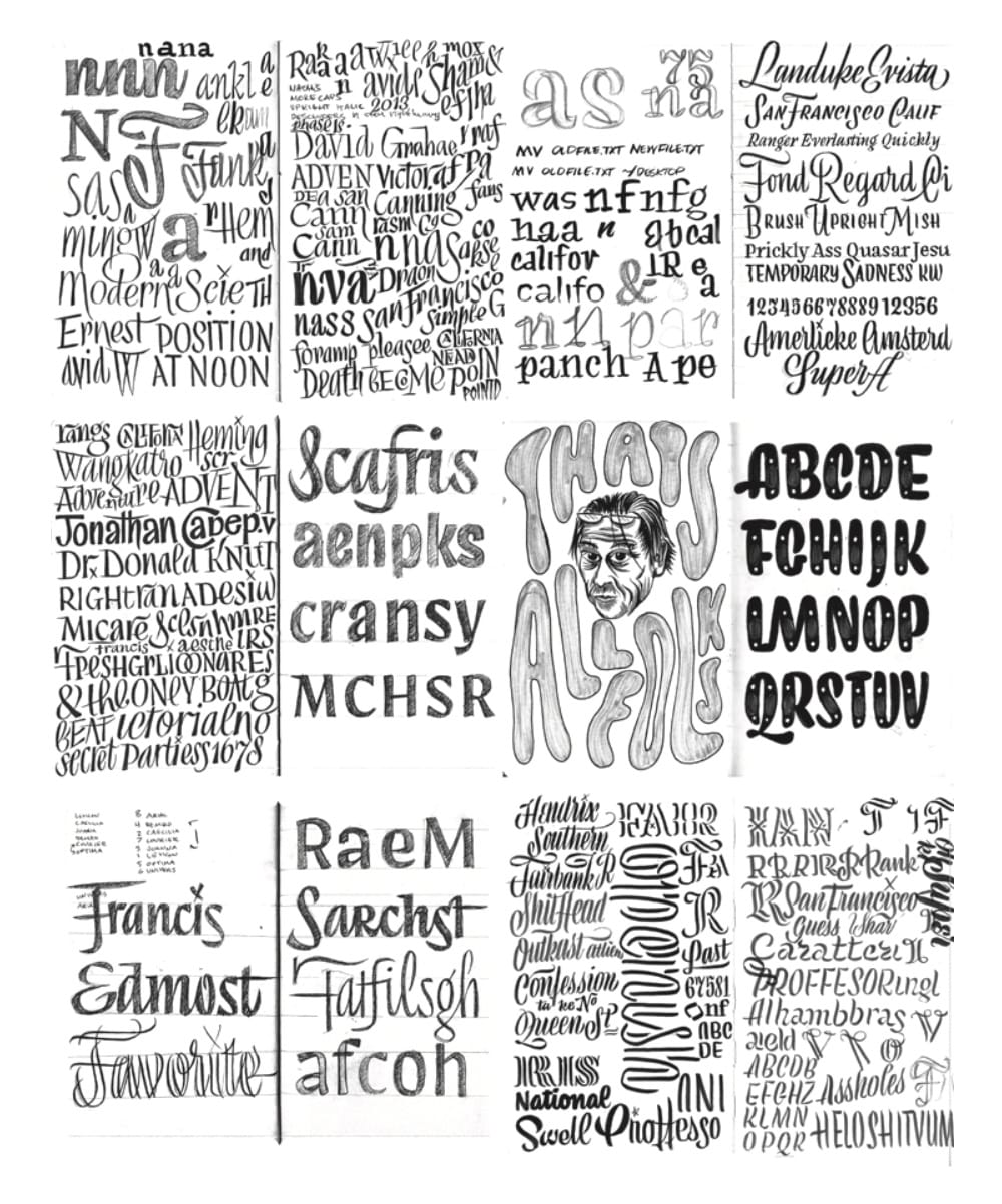 OH no has built such a distinct style, and you included a lot of your sketches in the book which are so packed with character. I’m curious, do you prefer the analog sketching part or bringing type to life digitally?
